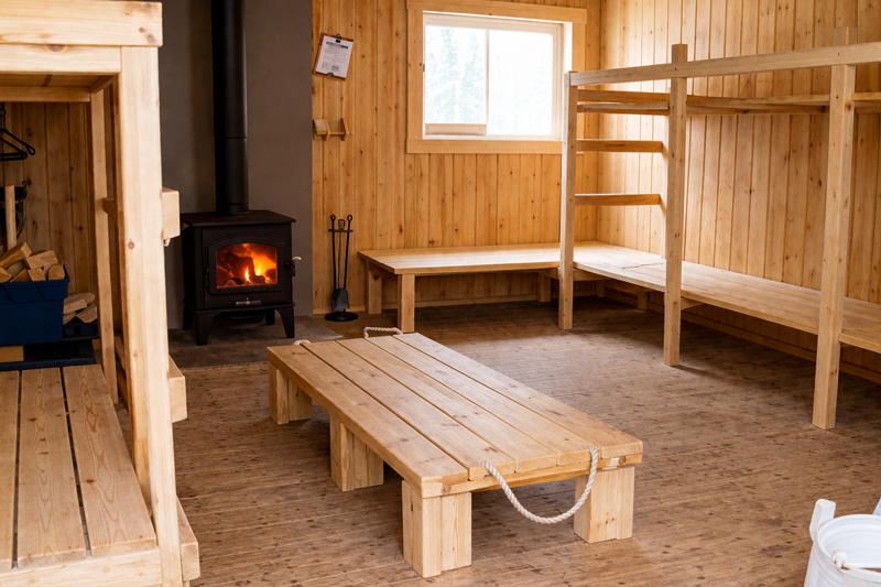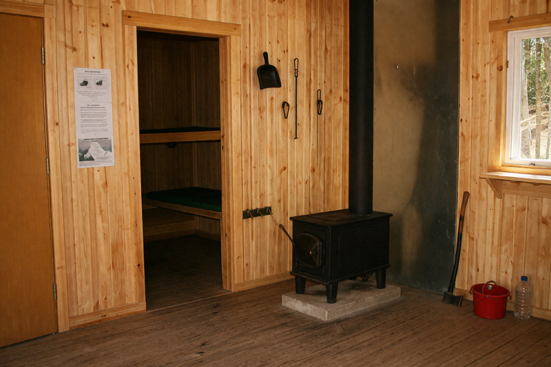 Équipement : Poêle à bois, couchettes, table et bancs, toilette sèche à proximité.